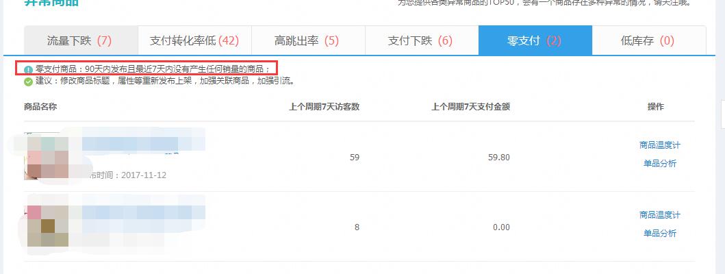 動(dòng)銷(xiāo)率對(duì)應(yīng)的就是滯銷(xiāo)產(chǎn)品,滯銷(xiāo)品也就是淘寶說(shuō)的 “零支付”寶貝,大家可以到生意參謀-異常商品來(lái)查看(如下圖)。