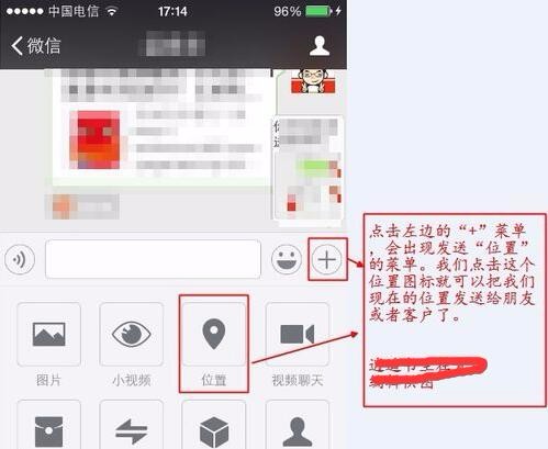 2、當(dāng)朋友找不到我們的時(shí)候,此時(shí)我們?cè)谥悄苁謾C(jī)上打開微信,找到朋友進(jìn)入聊天界面。點(diǎn)擊“+”菜單后,會(huì)出現(xiàn)“位置”圖標(biāo)。
