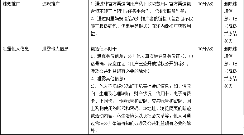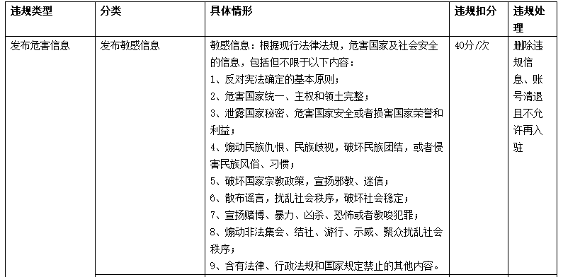 4、違規(guī)處理一覽表中根據(jù)違規(guī)嚴(yán)重程度調(diào)整了“發(fā)布淫穢色情信息”和“泄露他們信息”兩項(xiàng)的扣分。