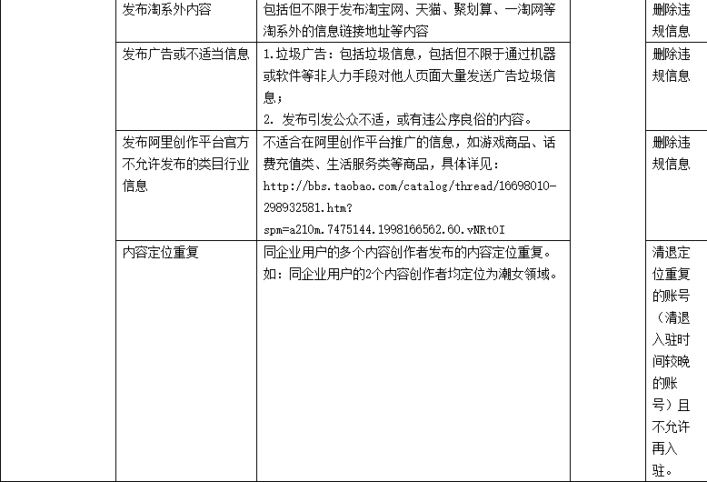 具體違規(guī)內(nèi)容及對(duì)應(yīng)違規(guī)管控措施詳見《阿里創(chuàng)作平臺(tái)管理規(guī)范(“微淘號(hào)·達(dá)人”適用)》違規(guī)處理一覽表。