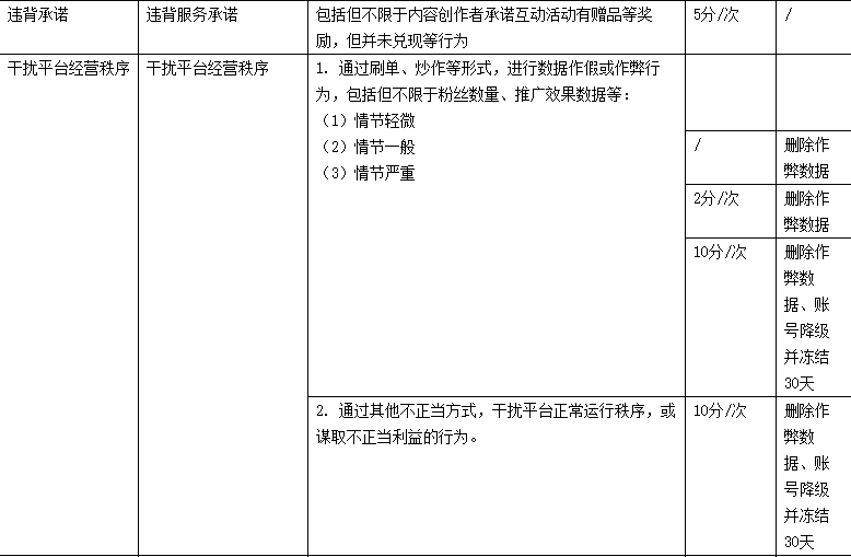 3、違規(guī)處理一覽表新增了“干擾平臺(tái)經(jīng)營(yíng)秩序”一項(xiàng)違規(guī)情形中不同情節(jié)的扣分和違規(guī)處理;