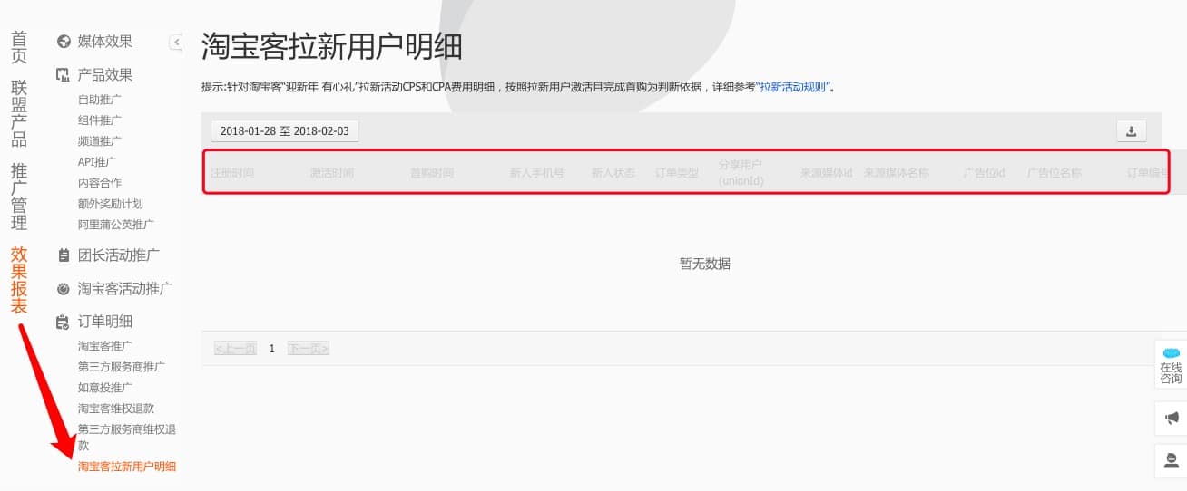 1、pc端淘寶聯(lián)盟后臺(tái):效果報(bào)表-訂單明細(xì)-淘寶客拉新用戶明細(xì)