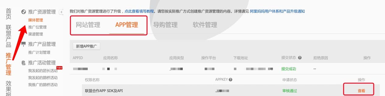 包括批量創(chuàng)建廣告位和淘寶客新用戶訂單api,均屬于淘寶客基礎(chǔ)api,可在聯(lián)盟后臺(tái)備案的appkey處查看權(quán)限