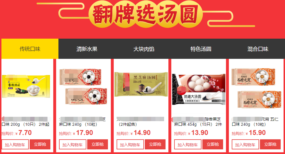 在“翻牌選湯圓”板塊,大家可以根據(jù)個人口味來挑選湯圓,這就看你喜歡傳統(tǒng)口味、清新水果味還是混合口味了,同樣是搶購價哦。