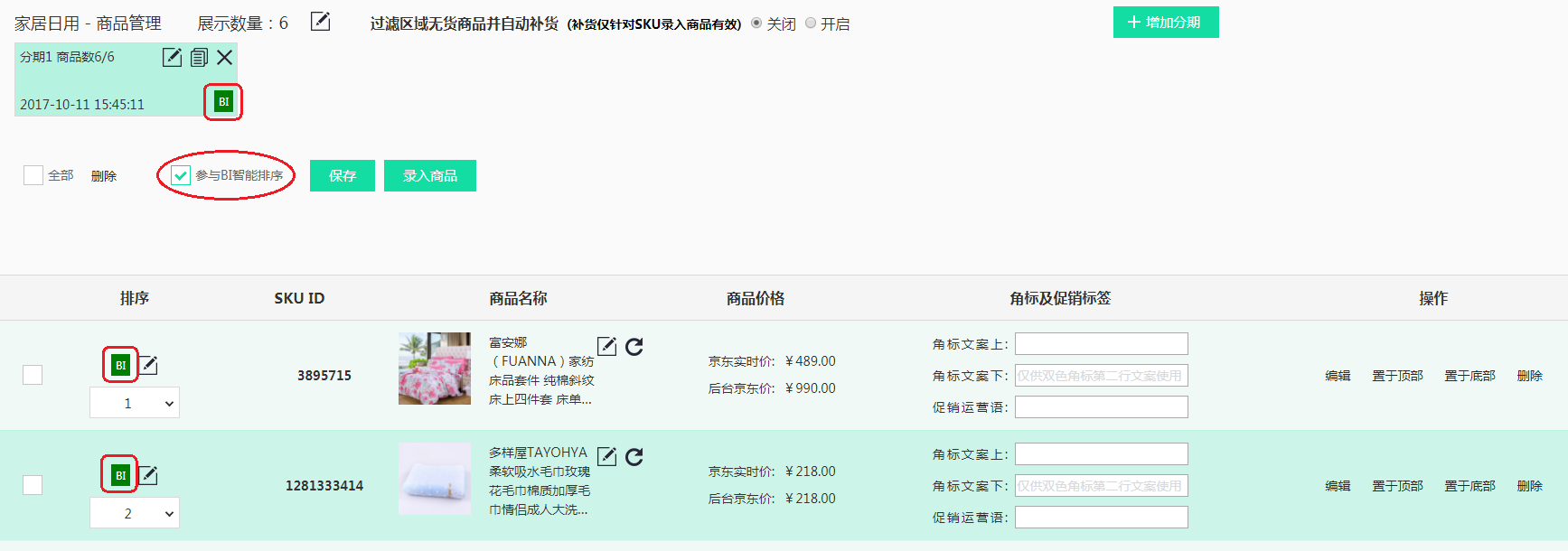 2. 開(kāi)啟BI后,對(duì)某商品進(jìn)行 置頂/不展示 操作