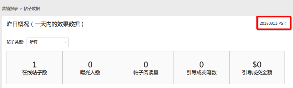 粉絲趴營銷報(bào)表包括2部分?jǐn)?shù)據(jù),分別是帖子數(shù)據(jù)和粉絲數(shù)據(jù),需要注意的是帖子數(shù)據(jù)報(bào)表下我們只展示最近30天有訪問行為的帖子數(shù)據(jù),如在線的帖子最近30天內(nèi)沒有被訪問的記錄則這個(gè)帖子的數(shù)據(jù)就不會(huì)出現(xiàn)在數(shù)據(jù)報(bào)表中,另外看數(shù)據(jù)我們首先關(guān)心的是數(shù)據(jù)的統(tǒng)計(jì)時(shí)間,粉絲趴營銷報(bào)表的數(shù)據(jù)統(tǒng)計(jì)時(shí)間都是美國時(shí)間,數(shù)據(jù)查詢頁面上會(huì)有數(shù)據(jù)的統(tǒng)計(jì)時(shí)間展示,如下圖紅框內(nèi)的日期就是當(dāng)前報(bào)表數(shù)據(jù)的統(tǒng)計(jì)時(shí)間: