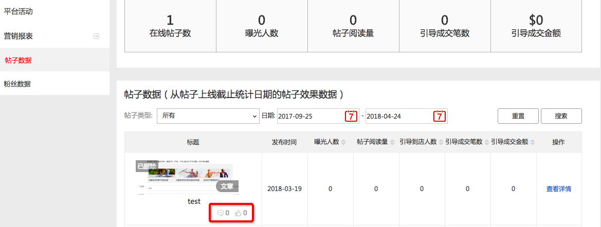 7、上圖標(biāo)紅區(qū)域是帖子的點(diǎn)贊和評論數(shù)據(jù),這兩個(gè)數(shù)據(jù)指標(biāo)都是累計(jì)的,展示的數(shù)字截止到統(tǒng)計(jì)日期的累計(jì)數(shù)據(jù)