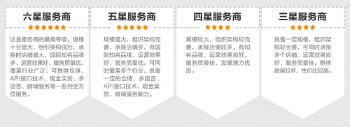 具體的介紹就到這里了,大家通過對上面的了解,就會知道運營服務商是有等級的劃分的,這樣做的目的就是互相的督促,不斷的向前發(fā)展,這樣對于商場的賣家們來說是一種保障哦。