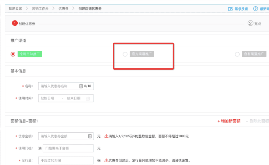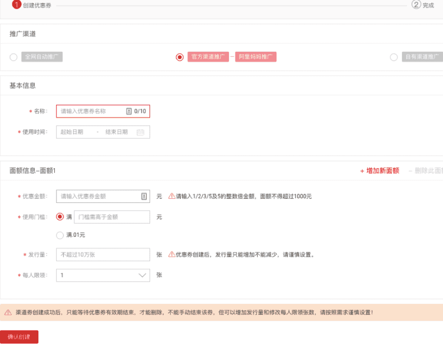 3、輸入券名稱-時(shí)間-面額-門檻-發(fā)行量信息,完成阿里媽媽推廣券的創(chuàng)建(注意避免門檻過(guò)低造成損失)