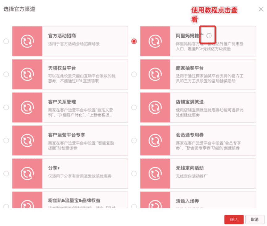 2、點(diǎn)擊創(chuàng)建“店鋪優(yōu)惠券”或“商品優(yōu)惠券”-選擇“官方渠道推廣”-“阿里媽媽推廣”