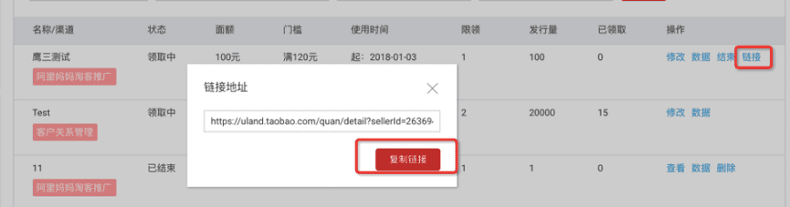 4、點(diǎn)擊返回列表-復(fù)制鏈接,可直接獲取對(duì)應(yīng)的阿里媽媽推廣券鏈接發(fā)送至淘寶客進(jìn)行專屬推廣