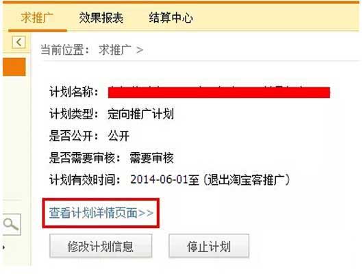 第三步、隨意點(diǎn)擊進(jìn)入一個(gè)計(jì)劃,下午紅框顯示的“查看計(jì)劃詳情頁面”,點(diǎn)擊進(jìn)去就能得到公開傭金計(jì)劃鏈接,把該鏈接發(fā)送給淘客就能申請了。如下圖。