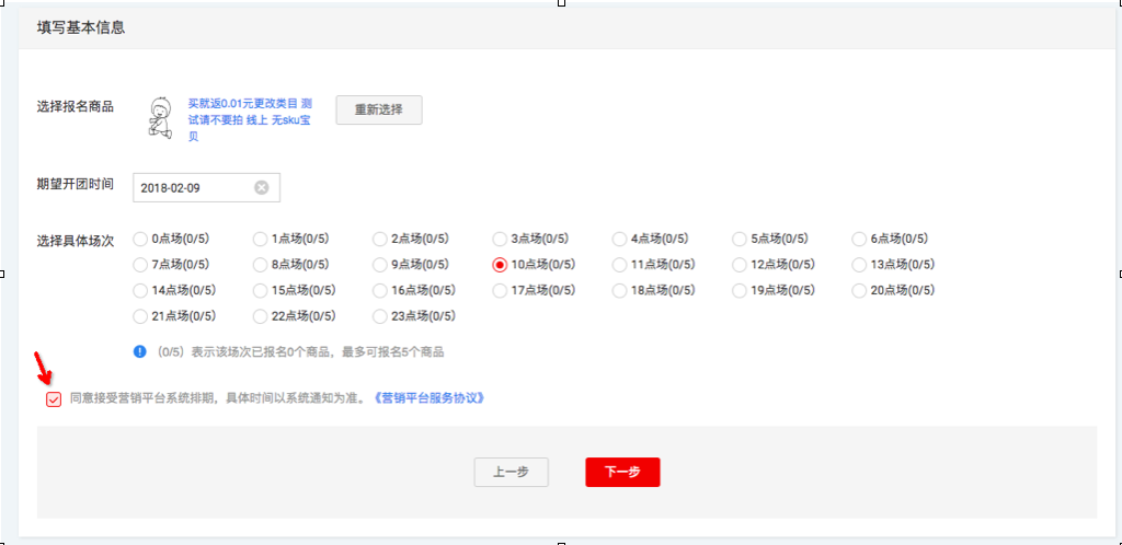 選擇自己計劃的開團(tuán)日期及場次。每個場次最多5件商品;可選擇日期為報名當(dāng)天的后3天,最晚可選時間為后13天;例如:今天為2月9號,最早可報名12號的活動,最晚可選時間為21號;