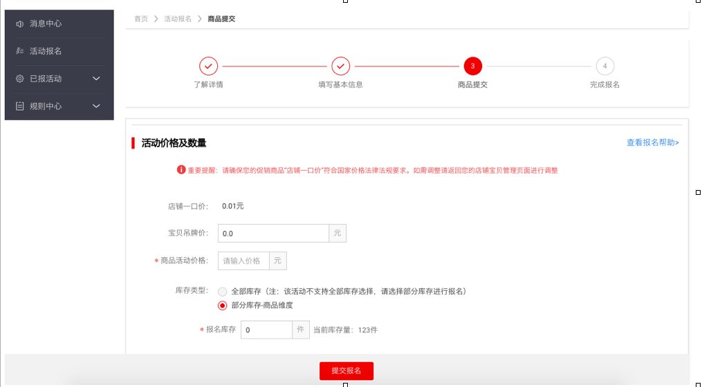 第九步:參加活動-商品提交:根據(jù)需要頁面字段需要,填寫符合規(guī)范要求的商品信息,并提交報名