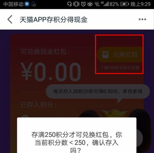 點擊存入50積分,接著點擊確認存入即可成功存入積分儲蓄罐,系統(tǒng)會提示兌換紅包要存滿250積分才可以。滿了250積分之后,就可以點擊右上角的兌換紅包按鈕來獲得紅包了?! ?/p>
