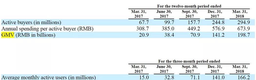從GMV方面的表現(xiàn)來看,拼多多的招股書顯示,截至2018年3月31日的過去12個(gè)月,拼多多的GMV(Gross Merchandise Volume,成交金額)為1987億元,有2.95億活躍買家,有超過100萬活躍商家。相比之下,阿里用了10年GMV突破1000億元,而京東用了6年時(shí)間,拼多多只用了不到3年。