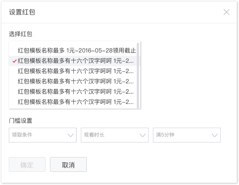 2- 領取條件設置:選擇【領取條件】可看到用戶所有行為項目,根據(jù)行為項目設置不同福利策略。如觀看5分鐘才可以領取的優(yōu)惠券
