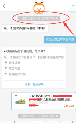 3、人工客服會發(fā)一個選擇訂單卡片,你將有問題的訂單選擇發(fā)給客服