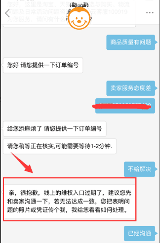 4、人工客服提醒先與賣家溝通,若無法達成一致,將商品問題或憑證,發(fā)給他確認