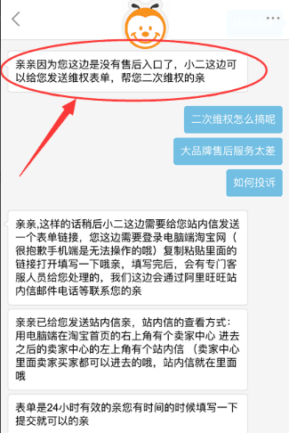5、淘寶人工客服確認問題后,會發(fā)送一個二次維權(quán)表單給你,讓你通過電腦登錄淘寶填寫