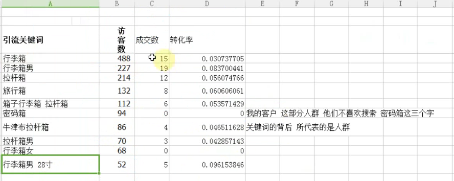 1.6)可以制作表格,可以計(jì)算出每個(gè)關(guān)鍵詞的轉(zhuǎn)化率,然后我就可以確定出我做這個(gè)產(chǎn)品的時(shí)候以那些關(guān)鍵詞作為我的核心關(guān)鍵詞,圍繞哪些關(guān)鍵詞去做;