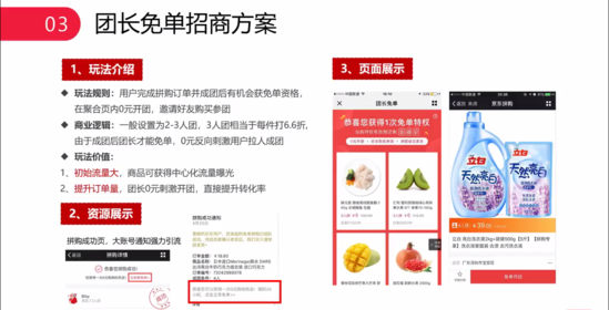 在“團(tuán)長(zhǎng)免單”活動(dòng)中,用戶完成拼購(gòu)訂單后,團(tuán)長(zhǎng)有機(jī)會(huì)獲得免單資格,通常商家設(shè)置為2-3人團(tuán)。該玩法可以讓商品獲得中心化流量曝光,同時(shí)提升訂單量。活動(dòng)時(shí)間為10月22日至11月15日?! ?/p>