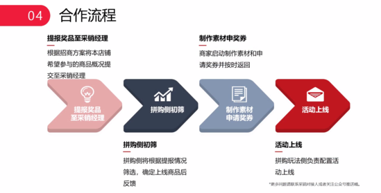 商家首先根據(jù)招商方案將提商品概況提報(bào)至采銷經(jīng)理,拼購(gòu)側(cè)會(huì)根據(jù)提報(bào)情況進(jìn)行篩選。收到反饋的商家可以啟動(dòng)制作素材和申請(qǐng)獎(jiǎng)券并按時(shí)返回,最后由拼購(gòu)?fù)娣▊?cè)負(fù)責(zé)配置活動(dòng)上線?! ?/p>