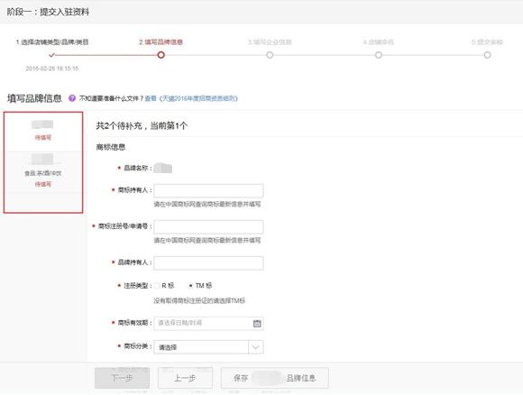 6、點(diǎn)擊【下一步】,填寫(xiě)品牌信息。
