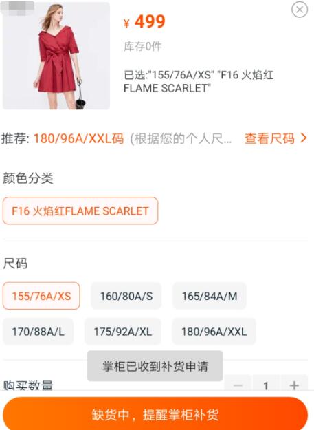 當(dāng)買家點擊某個缺貨商品的SKU維度時,在下方會出現(xiàn)補貨提醒的按鈕。點擊后根據(jù)是否建立專屬客服關(guān)系,系統(tǒng)會判斷是否下發(fā)“補貨申請已收到”卡片。