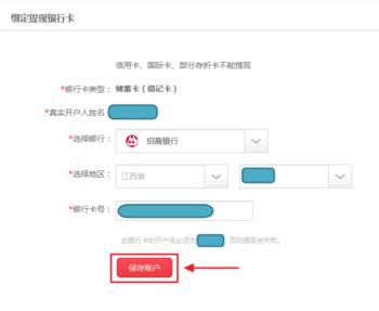 3)在添加銀行卡頁(yè)面,按照頁(yè)面要求填寫(xiě)銀行卡等信息,然后點(diǎn)擊“保存賬戶(hù)”完成綁定。