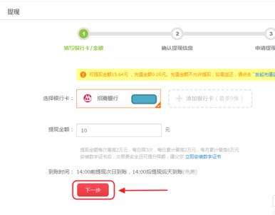 5)在“提現(xiàn)金額”中輸入提現(xiàn)金額,然后點(diǎn)擊“下一步”。