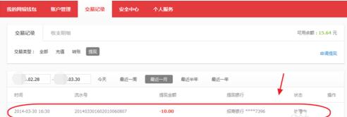 8)返回到網(wǎng)銀錢(qián)包首頁(yè)菜單中,選擇“交易記錄”,在下方列表中會(huì)顯示剛才的提現(xiàn)記錄,“狀態(tài)”顯示“處理中”,請(qǐng)等待相關(guān)工作人員的處理。