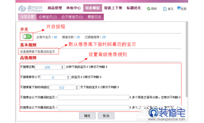 【全局設(shè)置】 使用智能櫥窗,系統(tǒng)默認(rèn)總是推薦離下架最近的寶貝,用戶也可自行設(shè)置高級(jí)規(guī)則,然后在根據(jù)店鋪實(shí)際情況選擇設(shè)置必推和不必推的寶貝,最后再點(diǎn)擊開...