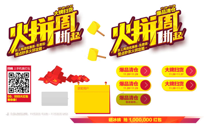 多個(gè)促銷(xiāo)類(lèi)圖標(biāo)組成的淘寶PSD分層素材,內(nèi)有火拼周、爆品清倉(cāng)、大牌清貨等內(nèi)容。